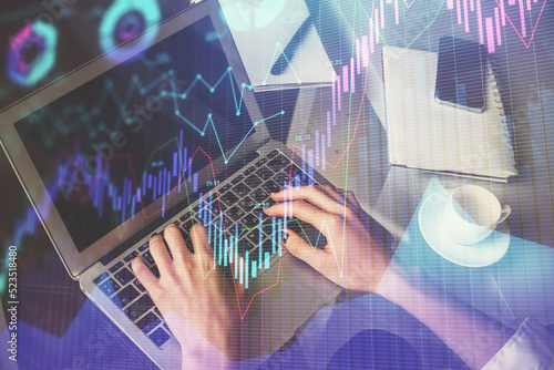 Double exposure of woman hands typing on computer and forex chart hologram drawing. Stock market invest concept.