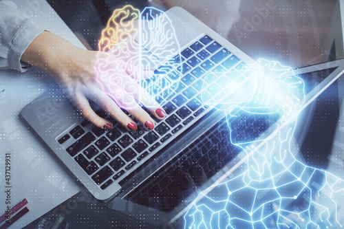 Double exposure of woman hands typing on computer and man in AR glasses drawing. Education concept.