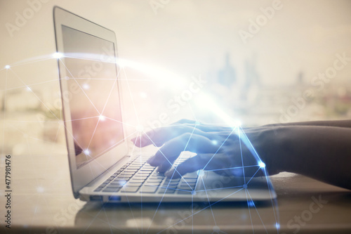 Double exposure of woman hands typing on computer and social network theme hologram drawing. People media concept.