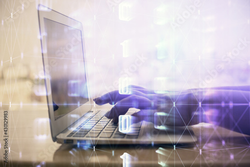 Double exposure of woman hands working on computer and data theme hologram drawing. Tech concept.