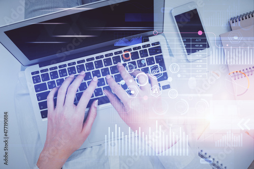 Double exposure of woman hands working on computer and data theme hologram drawing. Top View. Technology concept.