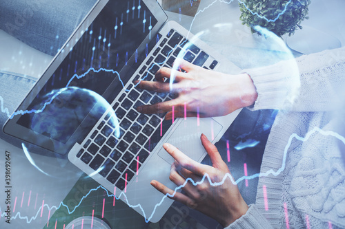 Double exposure of woman hands working on computer and forex chart hologram drawing. Top View. Financial analysis concept.