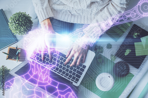 Double exposure of woman hands working on computer and man in ar glasses hologram drawing. Top View. Virtual reality concept.