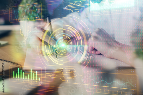 Double exposure of woman's hands on background with technology and digital coding icons. Data development concept. Close up.