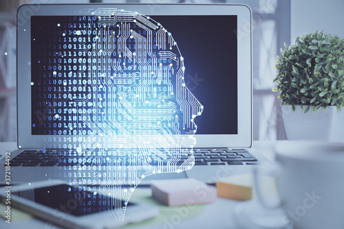 Double exposure of work space with computer and human brain drawing hologram. Brainstorm concept.