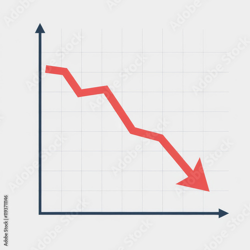 Downtrending economic chart with a red arrow. Financial chart showing statistical decline with a downward trajectory representing a stock market finance recession.