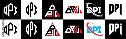 DPI letter logo design in six style. DPI polygon, circle, triangle, hexagon, flat and simple style with black and white color variation letter logo set in one artboard. DPI minimalist and classic logo