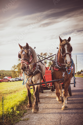 Draft horses pulling a carriage outside in summer