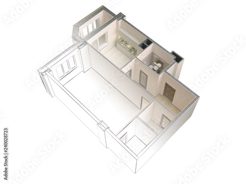 Draft sketch of a modern apartment contrasting with a realistic 3d rendering, top view, isolated