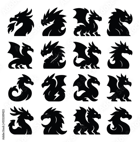Dragon icon collection in silhouette style. fantasy and mythical creature set