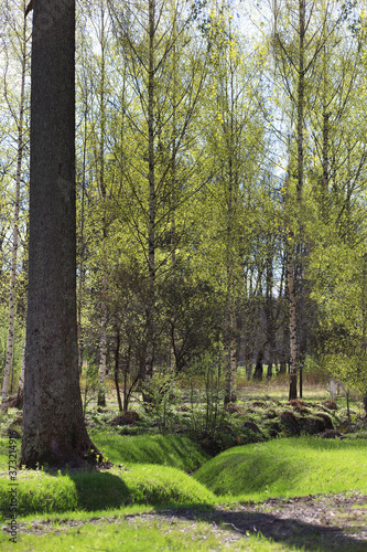 Drainage ditch overgrown with lawn grass surrounded by trees in the park