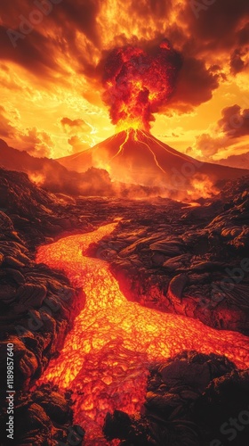 Dramatic and powerful volcanic eruption with lava flowing fiery explosion and plumes of smoke and ash billowing into the turbulent apocalyptic looking sky Destructive natural disaster in a chaotic