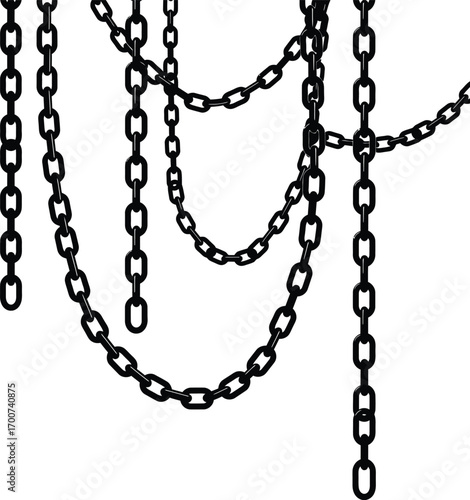 Dramatic black chains hanging against a stark white background, ideal for impactful design, themes of power, freedom, and security