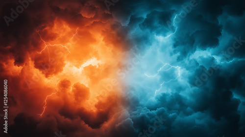 Dramatic clash of fiery red and cool blue storm clouds with lightning. Amazing colorful sky background