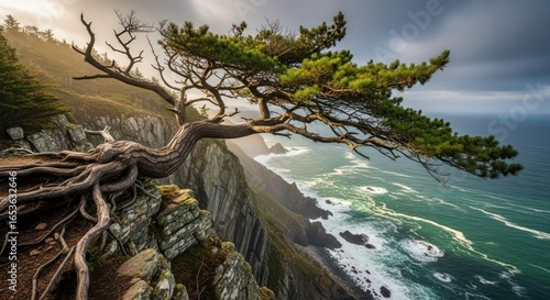 Dramatic Coastal Cliffside Landscape with Twisted Tree and Ocean View