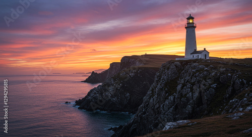 Dramatic Coastal Sunset: Lighthouse on Rocky Cliffs