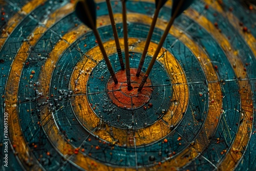 Dramatic depiction of multiple arrows hitting the center of a target board, showcasing teamwork and collective success in reaching goals
