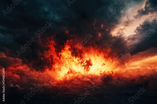 Dramatic Explosion with Fiery Flames and Dark Cloudy Sky Above the Ocean at Sunset