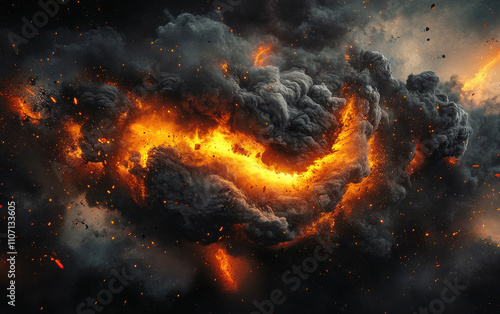 dramatic explosion with fiery orange and black smoke creates bold and intense scene, capturing raw power and energy of blast