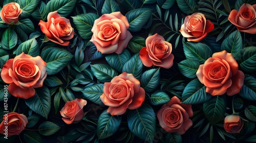 Dramatic floral pattern with vibrant roses and foliage on dark background