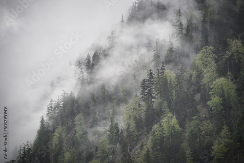 Dramatic fog over forest and dark mood in the mountains - Obersee Königssee Alps