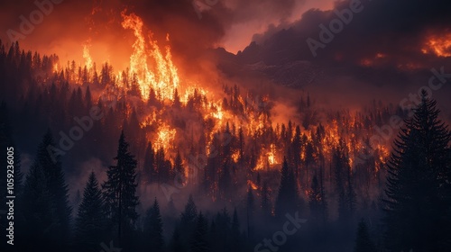 Dramatic Forest Fire Burning Brightly at Dusk with Smoke and Silhouetted Trees.
