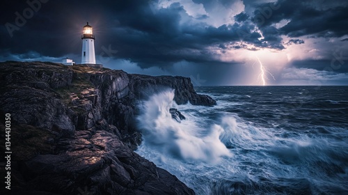 Dramatic lighthouse on cliff during stormy night with lightning strike and crashing waves.