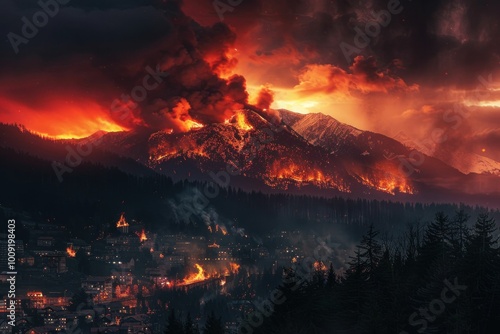 Dramatic mountain landscape engulfed in wildfire, with fiery skies and dark smoke billowing over a small town below