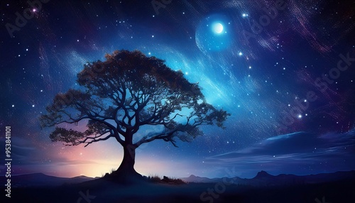 dramatic night background, tree and the starry sky with moonlight; a wonderful picture of nature