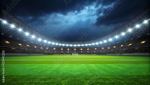 Dramatic Night Scene of an Illuminated Stadium with Grass Field and Cloudy Sky