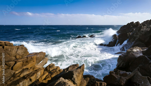 Dramatic ocean waves crashing against rugged coastal rocks under a vibrant blue sky. Perfect for travel, nature, and environmental projects.
