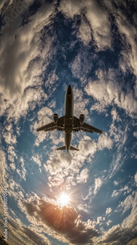 Dramatic perspective of a jet aircraft descending for landing framed by vibrant clouds highlighting the wonders of air travel and the thrill of flight.