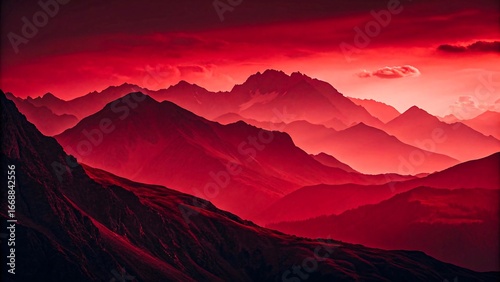 Dramatic red mountain landscape with layered peaks and misty valleys creating surreal atmospheric nature scene