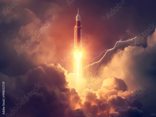 Dramatic Rocket Launch Amidst Thunderous Skies with Dazzling Lightning