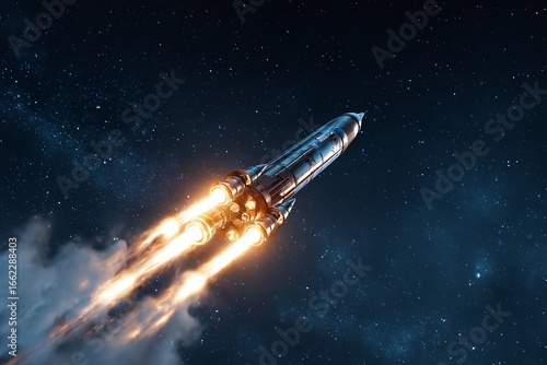 Dramatic rocket launch soars through a vibrant, star-studded cosmos towards the unknown.