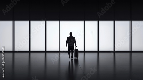 Dramatic silhouette image of a rushing traveler in an airport terminal with blurred motion and glass windows creating a minimalist modern scene The person is in a hurry