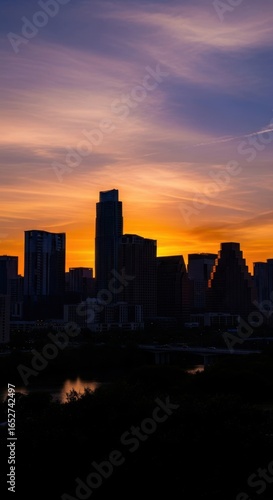 Dramatic silhouette of a modern cityscape against an colorful evening sky