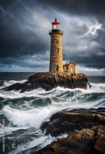 dramatic skies over stone lighthouse, architecture, beacon, coast, coastal, coastline, clouds, cloudy, cloudscape, dark, desolate, dusk, environment