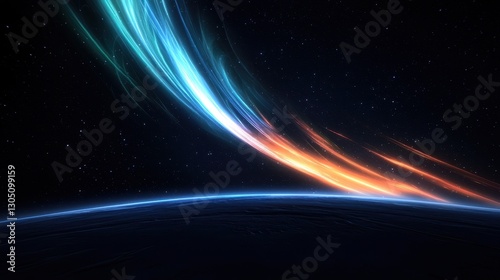 Dramatic Space Scene Showing a Planet with Bright Blue and Orange Light Trails Across the Starry Sky