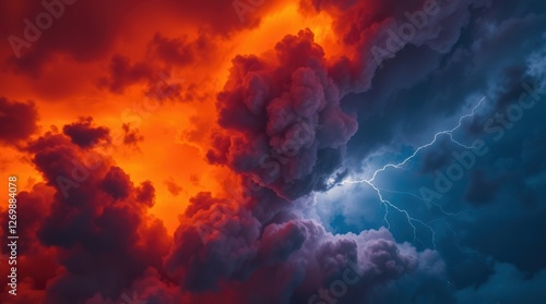 Dramatic stormscape with contrasting orange and blue clouds, punctuated by striking lightning bolts.