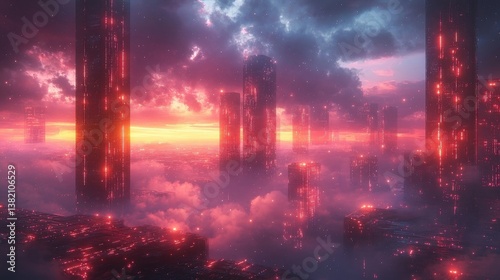 Dramatic Sunset Over Illuminated Cityscape With Towering Structures