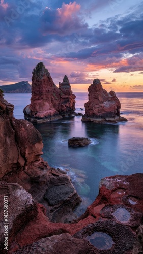 Dramatic sunset over rugged red rock coastline with teal ocean and colorful sky
