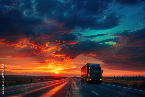 dramatic sunset view of a cargo truck on a highway silhouetted against a vivid orange and blue sky symbolizing global trade and logistics