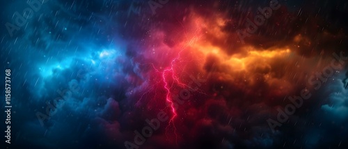 Dramatic Thunderstorm with Colorful Lightning Strikes Illuminating Dark Cloudy Sky