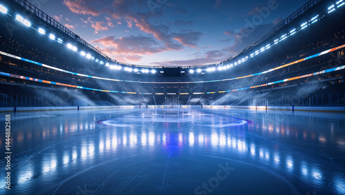 Dramatic view of an empty hockey arena with ice surface illuminated, ready for a game at dusk.