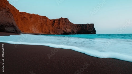 Dramatic view of red cliffs with turquoise waves gently lapping on a black sand beach