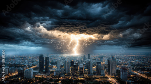 dramatic view of thunderstorm over city at dusk, showcasing lightning striking