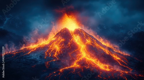 Dramatic volcanic eruption scene with lava flows against a cloudy sky