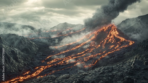 Dramatic Volcanic Landscape with Lava Flow and Rugged Terrain, Perfect for Intense and Powerful Visuals Generative AI