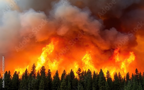 Dramatic wildfire raging through a dense forest, producing thick smoke and intense flames, showcasing the power of nature's fury.